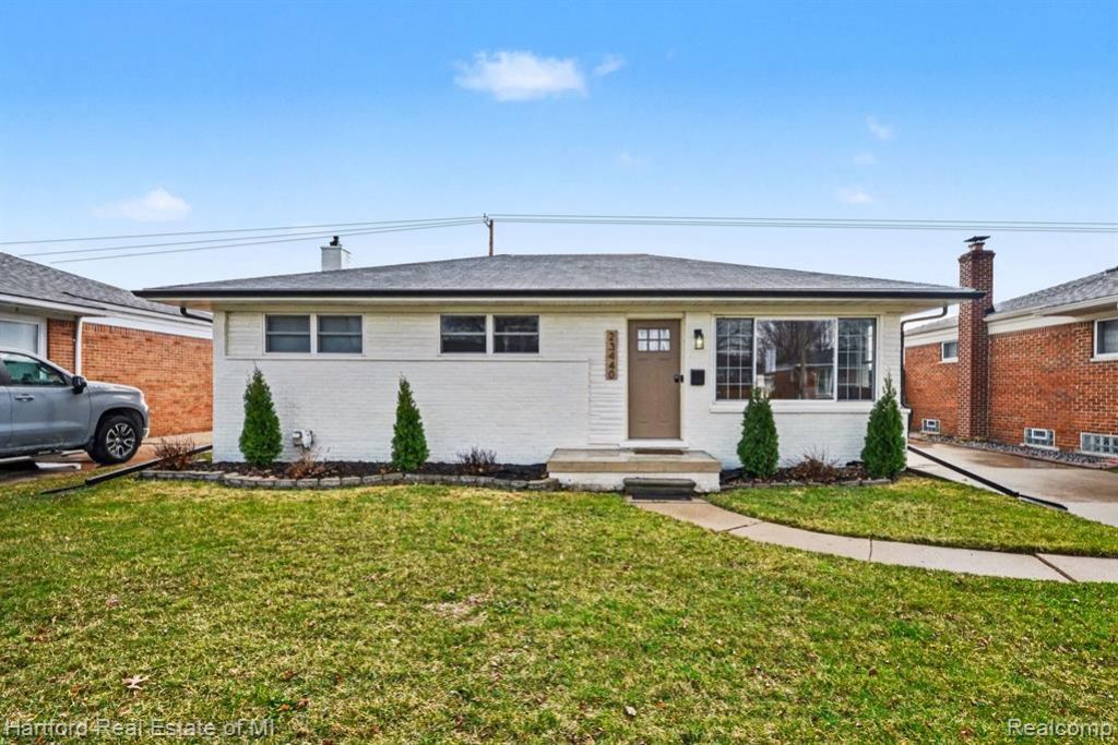 Welcome to this stunning 3-bedroom, 2 full bathroom brick ranch, perfectly situated in a desirable neighborhood of well-maintained homes just nine houses from Jefferson Avenue—placing beautiful Lake St. Clair just moments away. From the moment you arrive, you’ll appreciate the exceptional curb appeal. Inside, a spacious living room with a cozy fireplace flows seamlessly into the open eat-in kitchen, featuring white and sage shaker cabinetry, quartz countertops, recessed lighting, and newer windows that fill the space with natural light. Consistent wood-look flooring throughout and a light, neutral color palette create a clean, modern feel. All three bedrooms are generously sized, offering ample closet space and coordinated window treatments. The main floor bathroom is impressively large, showcasing a newer white tub with a classic tile surround and matching tile flooring. The open custom staircase leads to a beautifully finished basement—perfect for entertaining. Enjoy a large recreation area ideal for watching the game, along with additional space for games or gatherings. Plush carpeting adds warmth and comfort, and a second full bathroom provides added convenience. You’ll also find a spacious laundry area and abundant storage. Step outside to enjoy the thoughtfully landscaped yard, complete with a 1.5-car garage, covered backyard patio, and charming front porch. Enjoy having no neighbors behind you (the school construction is new baseball fields going in). Veterans Memorial Park is just a short walk away, and the home offers easy access to expressways, dining, shopping, and places of worship. This is truly a move-in ready home that combines comfort, style, and an unbeatable location. Sale includes backyard patio furniture and rug. Please exclude basement mantle above the fireplace, front door video doorbell, art work marquis lights on main floor hallway art, pool table and pool table light above it (seller will swap out the light), .