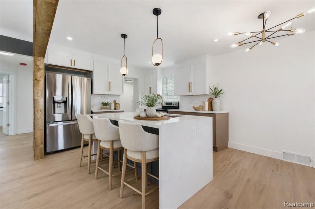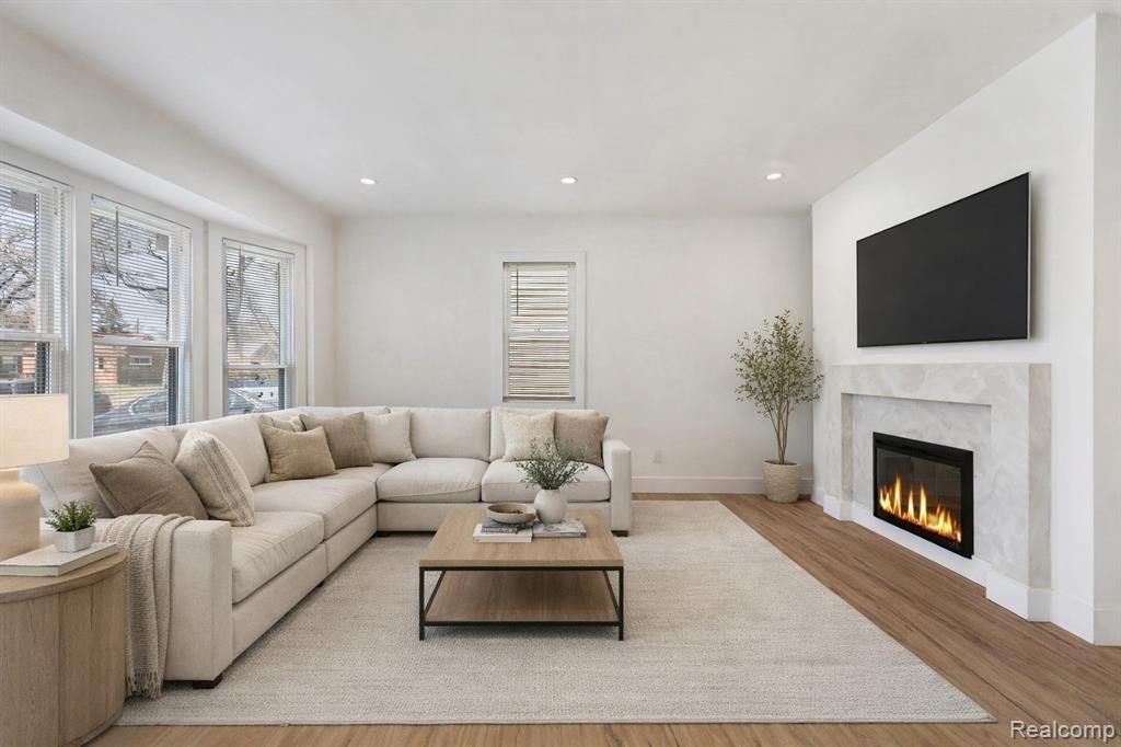 Welcome home to this modern gem, this is one you don’t want to miss! Looking for custom finishes? Look no further! Home undertook a complete and thorough renovation, brand-new roof with smart ventilation, new smart AC unit and new windows, offering major value and peace of mind. The home features a custom-built kitchen with quartz countertops, waterfall island, backsplash, new oven and dishwasher, a custom fireplace, and two tiled bathrooms with quartz countertops. A custom staircase leads to the third bedroom, and the finished basement includes a fourth bedroom, and multiple storage rooms. Located just a 3-minute drive to I-75, this move-in-ready home offers peace of mind with all major updates already completed. Central to Royal Oak, Berkley, Ferndale, and the 696 corridor. Come on by and check out Oak Park’s hottest gem!