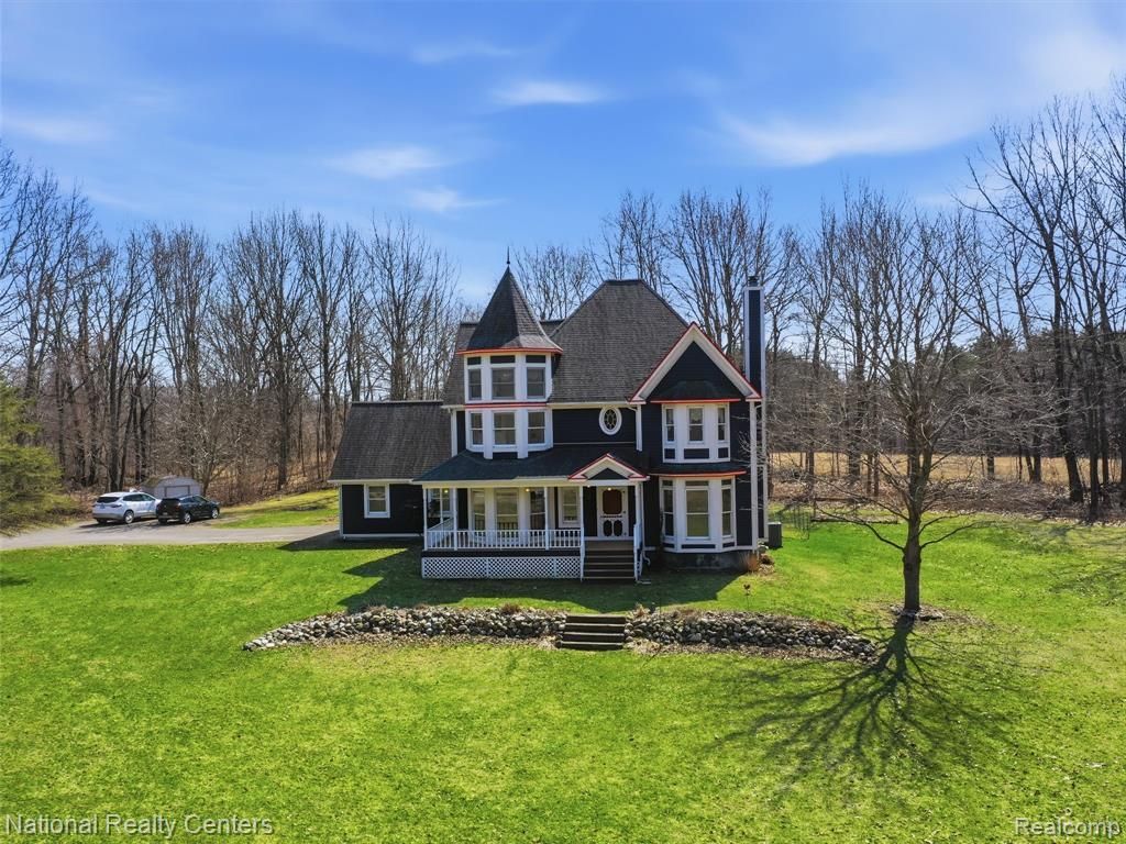 Nestled on 6.7 partially wooded acres, this beautiful Victorian-style home offers the perfect blend of privacy, nature, and timeless charm. Wildlife is a daily sight (hunting allowed), and the private pond offers opportunities for winter skating and hockey. Thoughtfully built with 2x6 construction and extra insulation, the home features 9-foot ceilings and expansive windows that flood the interior with natural light while framing peaceful views of the surrounding landscape. Warm oak flooring, newer quartz countertops, and built-in main floor speakers add both elegance and comfort. Additional features include 50-year shingles and generator-ready hookup for peace of mind. The primary suite offers a truly special retreat, highlighted by a window-lined turret surrounding a large jetted tub, creating a bright, spa-like space. Flex rooms on both the main and second floors provide ideal space for a home office, studio, or guest accommodations. With high-speed internet for easy work-from-home living, a finished basement stubbed for a future bathroom, and abundant storage throughout, this home offers both flexibility and function. A rare opportunity to enjoy privacy, light, and the beauty of nature—all in a home designed for comfortable everyday living and memorable gatherings.